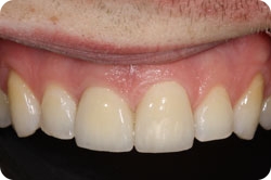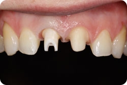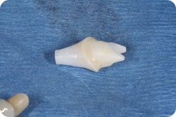 A custom healing abutment is fabricated chairside by Dr. Hall at the time of implant placement in cases where the implant is placed at the time of tooth extraction. The abutment is contoured to fit the soft tissue profile precisely in an effort to maintain the natural gingival architecture. This component profile is duplicated in the final custom abutment that supports the final crown.